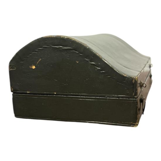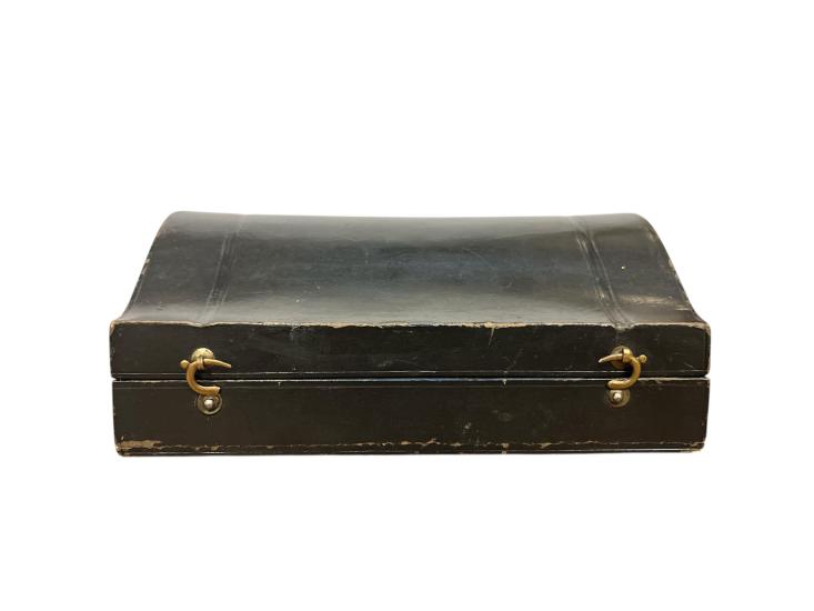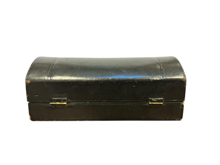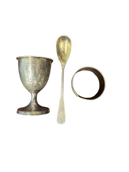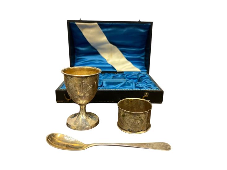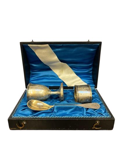 Cestovní sada na vařená vejce z alpaky v původní etui. Výška stojánku na vejce 6 cm, průměr 4 cm, délka lžičky 11,5 cm, průměr kruhové části 4 cm, šířka 2,5 cm. Rozměr etue 15,5 x 10 cm, výška 6 cm.