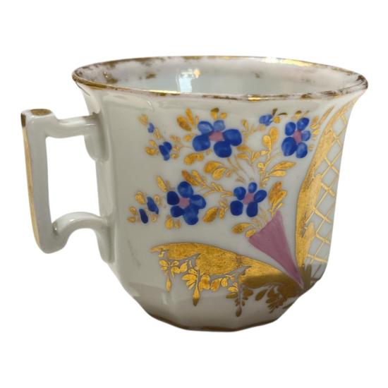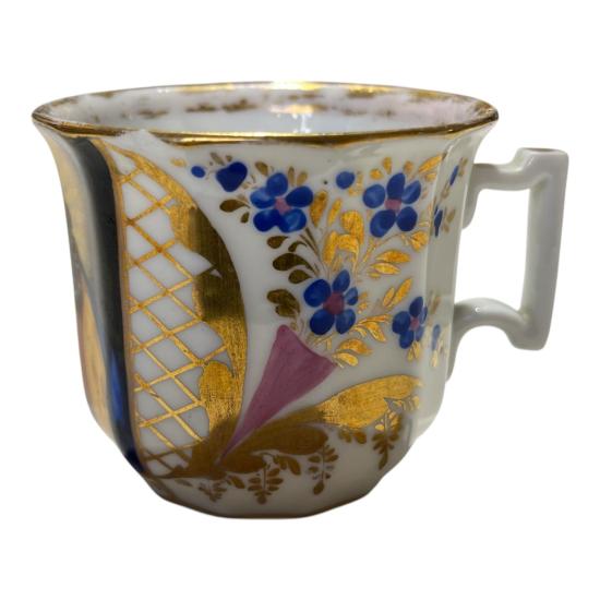 Starožitný drobný šálek s bohatým florálním dekorem a malbou Ježíše. Z vnější hrany hrdla drobný oťuk, zlacení je místy ošoupané,nejvíce na lemování. Průměr hrdla je 7,5 cm, průměr podstavy je 5 cm. Na výšku měří 6 cm. Neznačeno