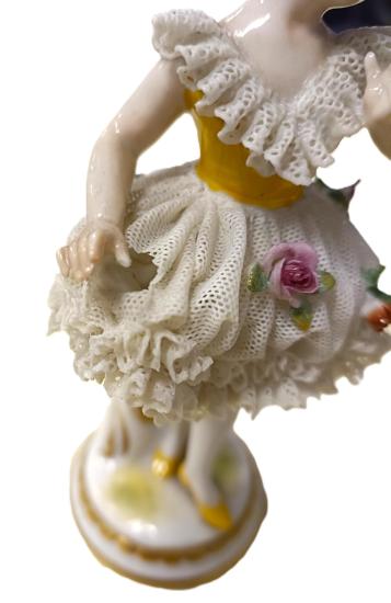 Krásná soška tanečnice v tylové sukni. Jedná se o předmět z německé manufaktury Volkstedt, z dílny Müller & CO. Soška je vysoká 14cm na podstavci o šířce 4,5cm. Sukně je mírně poškozená, viz foto. Značeno.