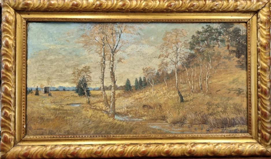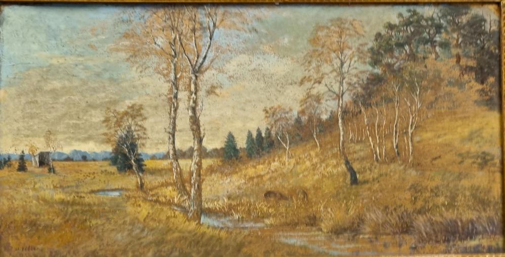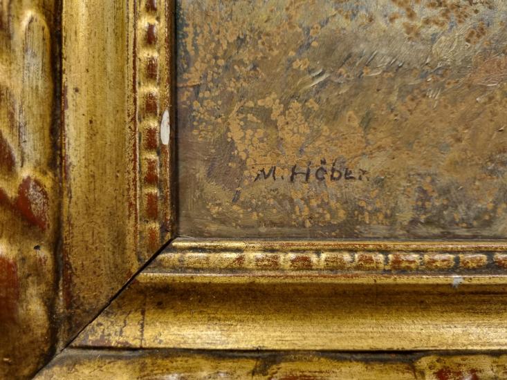 Příjemná, detailní malba projasněné krajiny s pohledem na břízky, rostoucí podél bystřiny, u níž se pase pár vysoké zvěře. Olej na kartonu. Zarámováno do masivního dřevěného rámu se zlatou patinou. Rozměry malby jsou 77 x 40 cm, rozměry s rámem jsou 93 x 55 cm. Karton je na pravé straně nahoře v rohu mírně poškozen. Signováno na levé straně dole M. Höber.