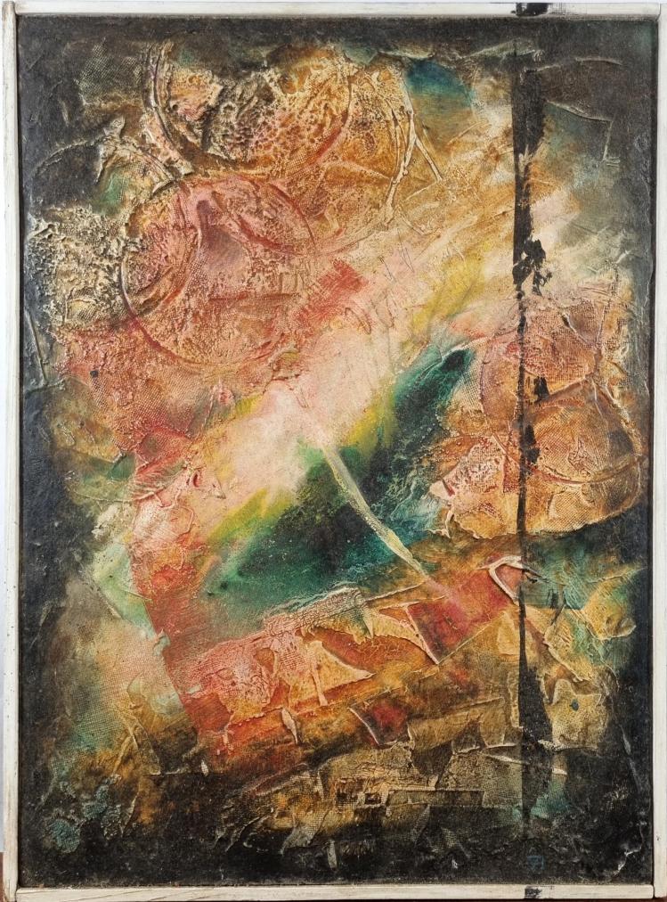 Zajímavé abstraktní dílo plné reliéfních struktur a příjemných barevných přechodů. Autor vytváří explozi barev, nejvýrazněji používá rudý odstín, který v kombinaci s černými okraji působí, jako by z díla zářil. Při bližsím pohledu se můžeme nořit do vzniklých struktur a reliéfů, které autor vytvořil. Kombinovaná technika na sololitu, rámováno, rozměry s rámem 43 x 32 cm, rozměry díla 42 x 31 cm. Signováno vpravo dle "A.".