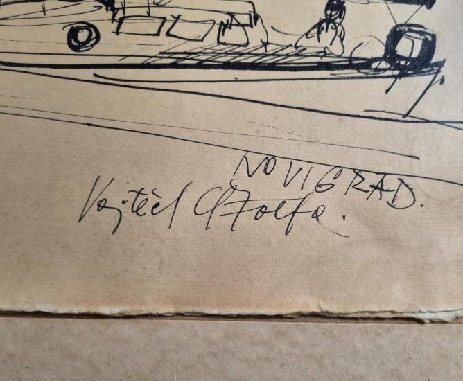 Zjednodušená kresba tvořená z rychlých sebejistých tahů tuší na papíře, od autora Miroslava Štolfy. Autor zachycuje pohled na loďky kotvící v přístavu a zaparkované vozidlo. Rozměry kresby jsou 42 x 59 cm. Celkové rozměry s rámem jsou 63 x 78 cm. Papír je z pasparty uvolněný. Signatura se nachází na pravé straně dole: Vojtěch Štolfa, Novigrad.