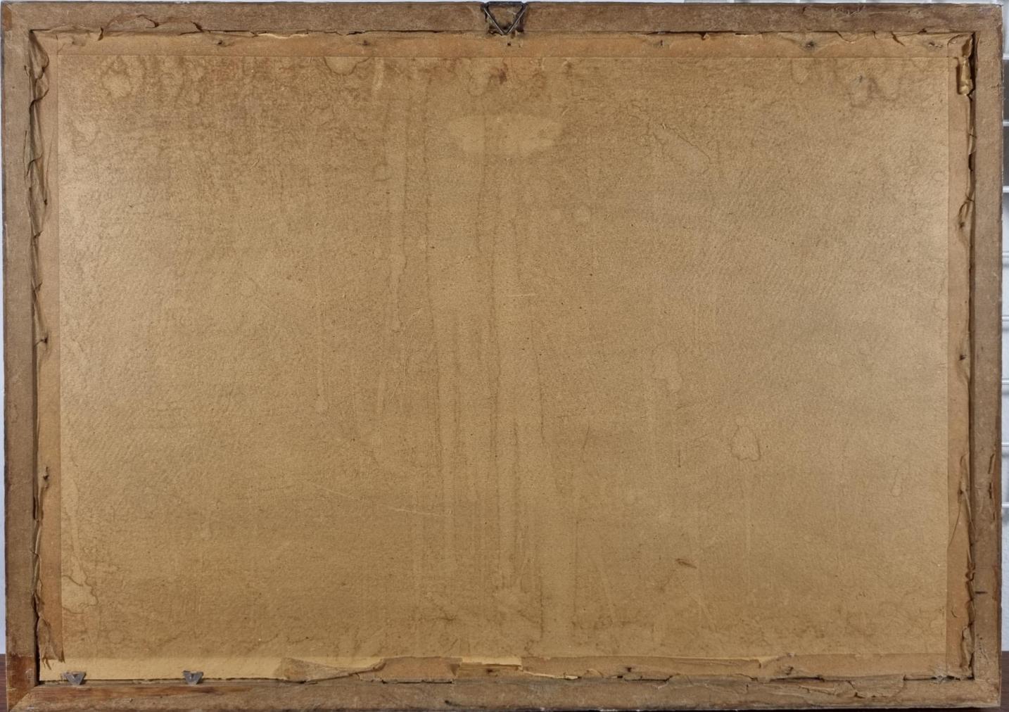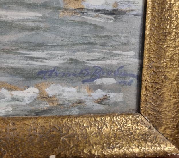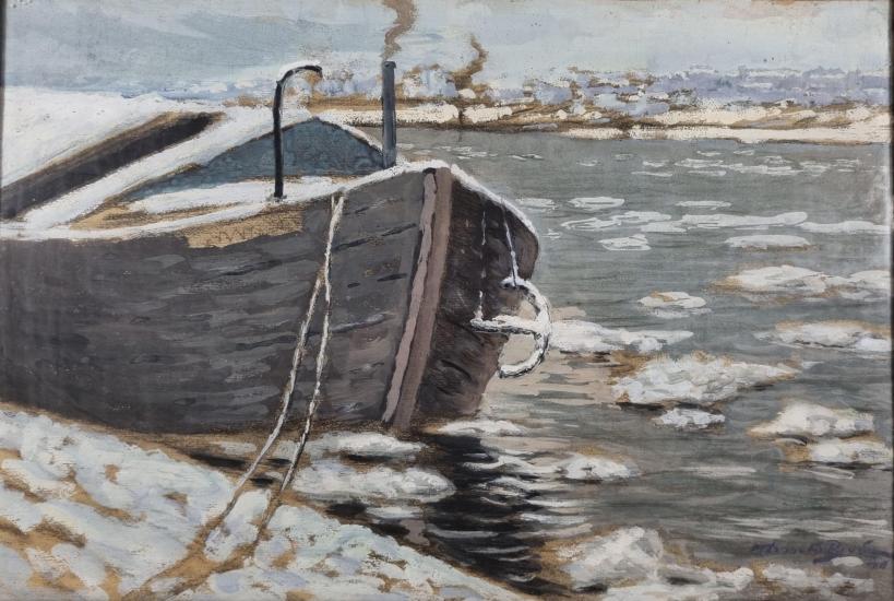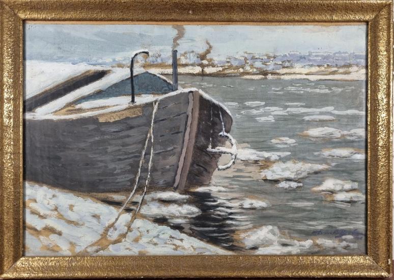 Obraz s námětem zasněžené krajiny s rybníkem s ukotvenou loďkou u břehu. Poklidný námět je převážně tvořený bílou barvou, sněhová pokrývka zahaluje krajinu do poetického ticha. Jediným dynamickým prvkem se stává hladina vody, na které vítr vytváří jemné vlnky. Kombinovaná technika na papíře, rámováno pod sklem, rozměry s rámem 58 x 41 cm, rozměr díla 52 x 35 cm. Signováno vpravo dole ???.
