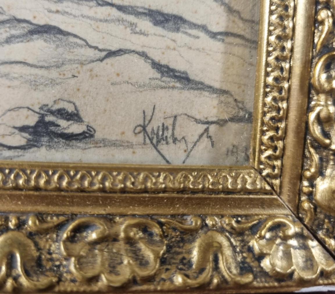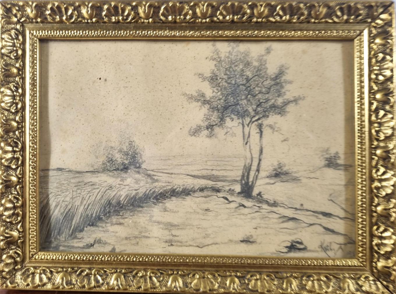 Jednoduchá kresba tužkou s motivem koutu krajiny, ve které se tyčí strom. Umělec prostřednictvím jemných šrafur vytváří realistickou přírodu, stébla ohnutá větrem, kamení na cestě a horizont nechává vyznít v jemné lince, která se ztrácí. Samotná plocha čistého papíru výjev dotváří. Kresba na papíře, rámováno pod sklem, rozměry s rámem 24,5 x 18,5 cm, rozměry díla 20 x 14 cm. Signováno vpravo dole, nerozpoznáno.