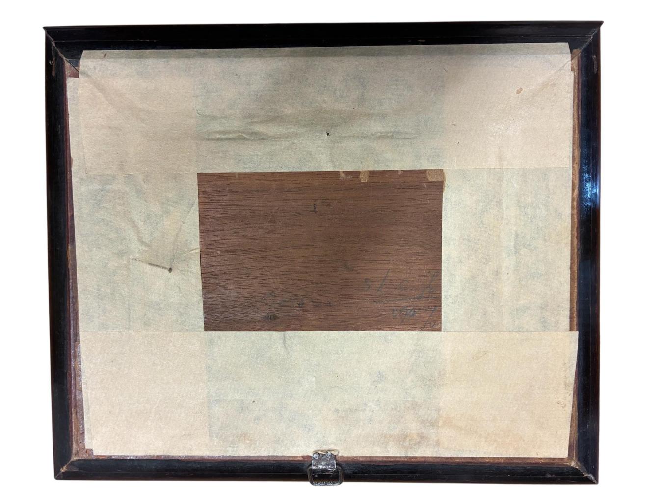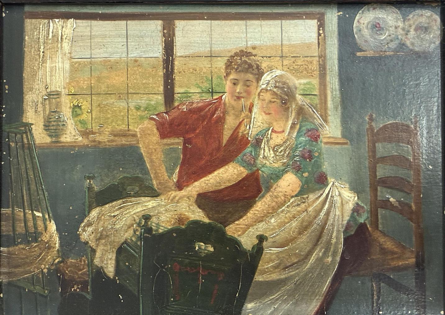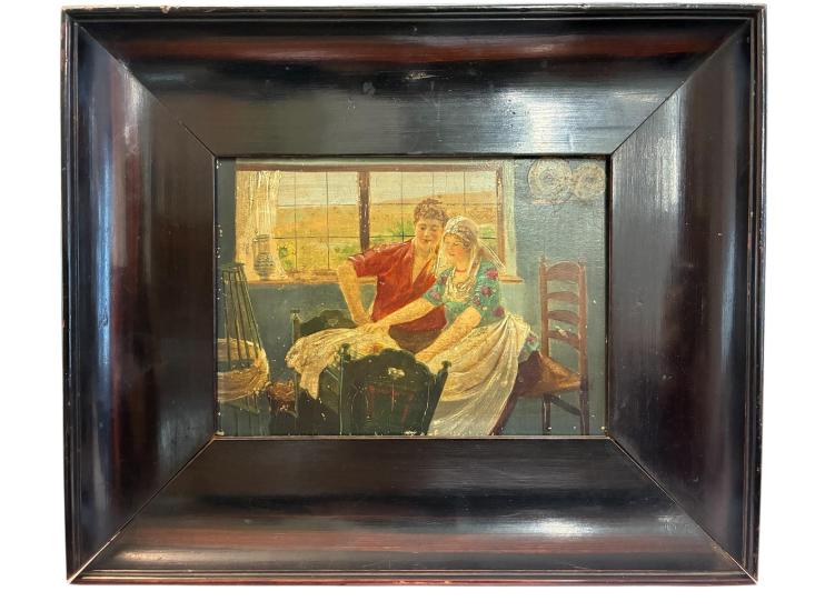 Žánrová scéna vyzobrazuje mladý pár sedící u kolébky. Výjev díky domácímu prostředí a šťastně vypadajícímu páru působí klidným dojmem. Obrázek se nachází v dřevěném rámečku. . Jedná se o olejomalbu na dřevěné desce. Rozměry s rámem 23 x 20 cm a bez rámu 14 x 10 cm. Nesignováno.