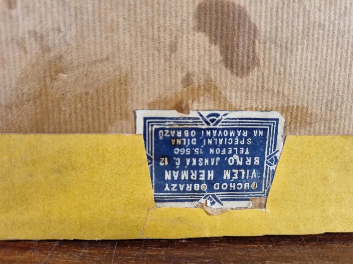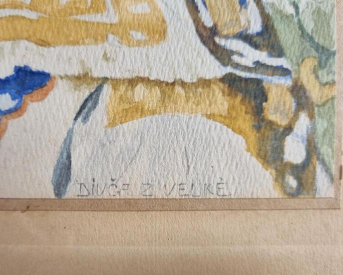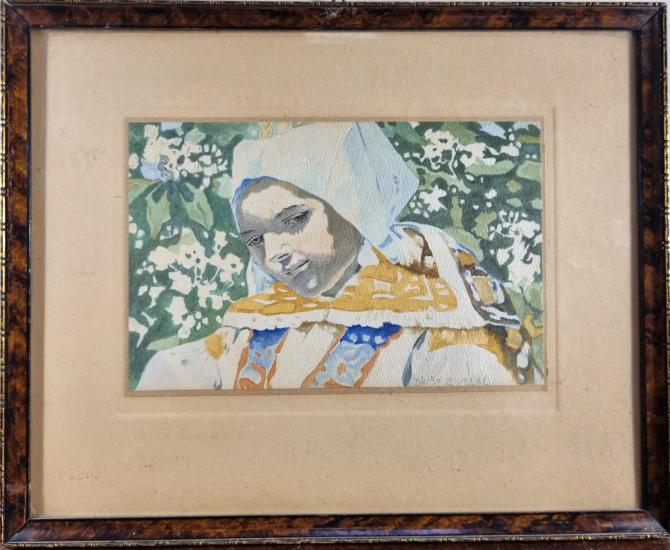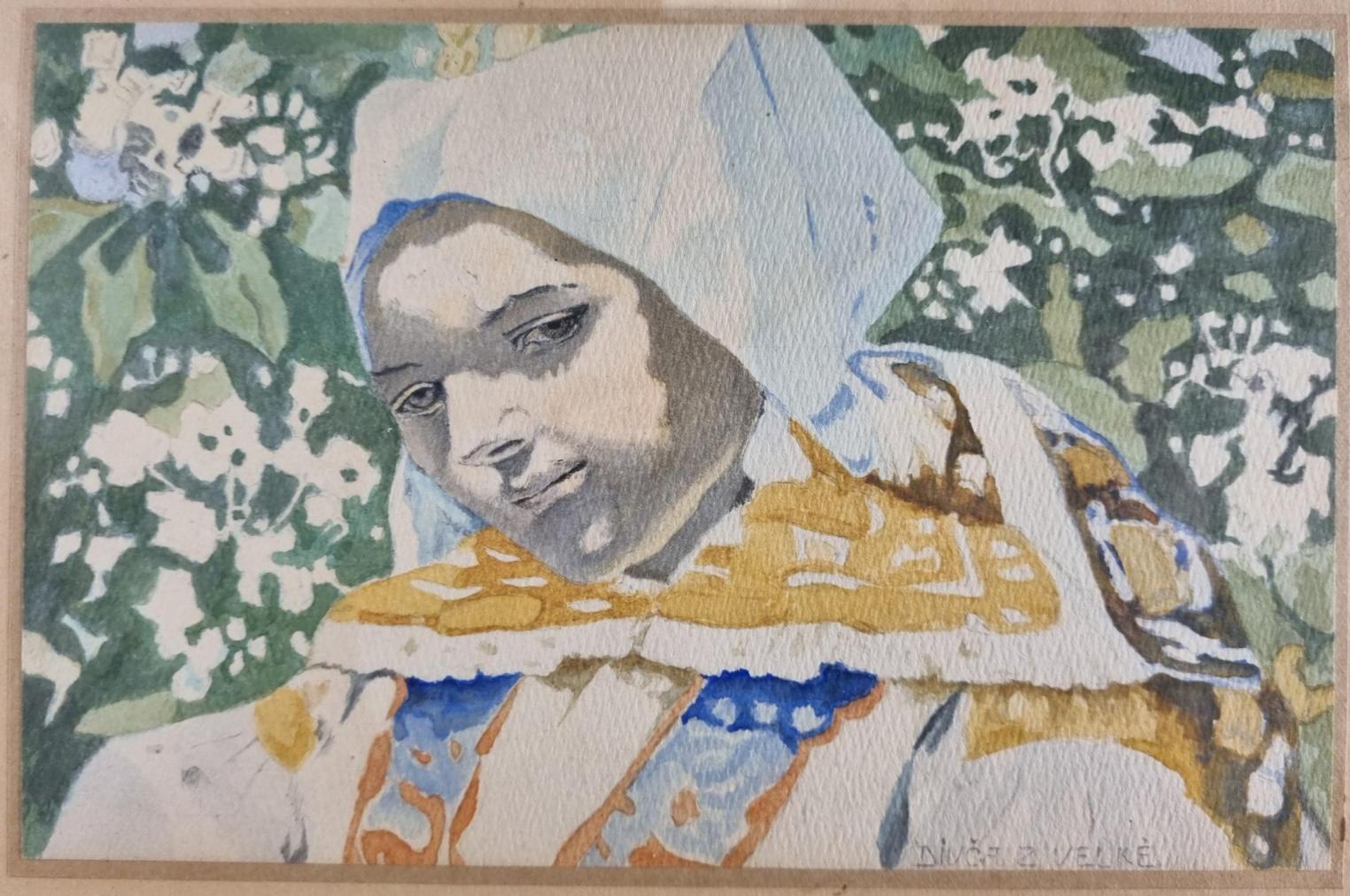 Drobná malba vyobrazující dívku v kroji. Autor dokáže prostřednictvím jemných tónovaných ploch bez ostrých linek a hran vytvořit půvabný portrét oslavující krásu folklóru. Pozadí tvoří zelené listy, kterými prostupují paprsky slunce. Akvarel na papíře, rámováno pod sklem, rozměry s rámem 32,5 x 26,5 cm, rozměry díla 20 x 13 cm. Nesignováno.