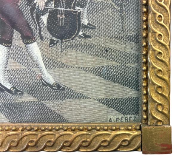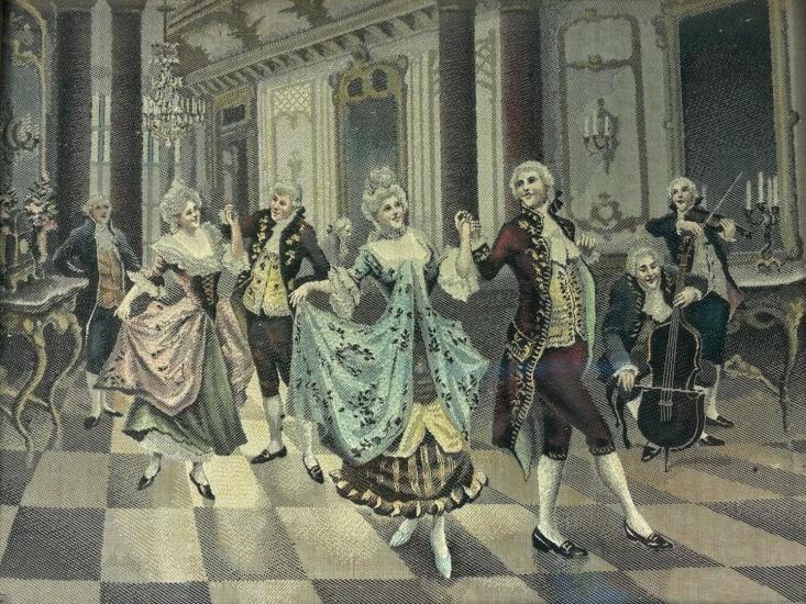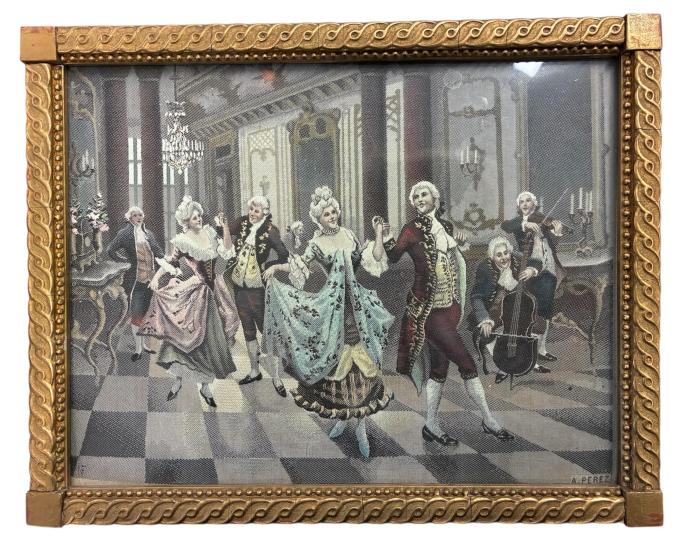 Vyšívaná tapisére na motivy obrazu od španělského malíře Alonso Pérez s tématikou rokokového plesu. Na tapisérii je skupinka tančících párů, které předvádí tradiční dobové tance. Celá scéna se odehrává i s tématicky dekorovaným interiérem a hudebníky. Struktura je krásně čitelná a rozpoznatelná i na dálku. V pravém dolním rohu je nápis A. PEREZ a na druhé straně jsou iniciály NF, což je značka firmy Neyret Frères vyrábějící tapisérie. Obraz je v rámu pod sklem. Rozměry s rámem 20 x 16 cm a bez rámu 17 x 13 cm.