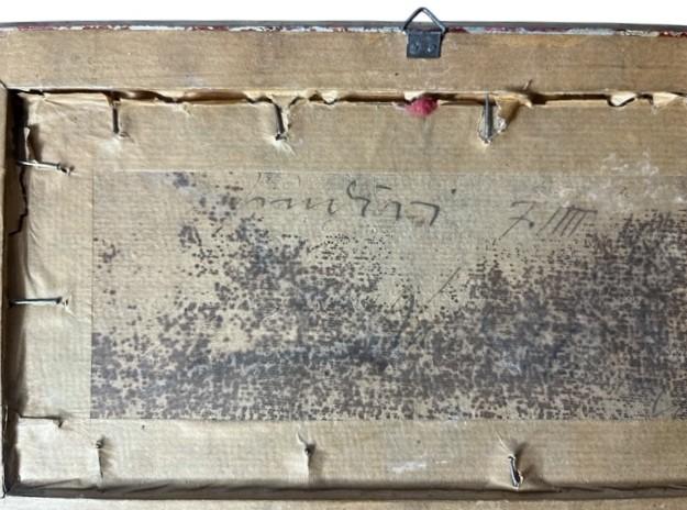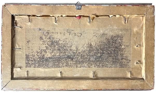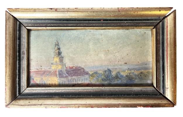 Skvělá malba malého podlouhlého formátu s výhledem na věžičku. Umělec vytváří dílo za pomocí silnějších nánosů barev, místy vystupuje barva z podkladu a vytváří lehce plastický efekt. V díle autor používá tlumené tóny a vytváří tak zajímavou nostalgickou atmosféru. Olej na plátně nalepeném na desce nebo kartonu, rozměry s rámem 28,5 x 16,5 cm, rozměry díla 10 x 22 cm. Signováno vlevo dole "M.K."? Stav viz foto - hnědé flíčky.