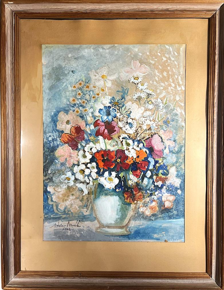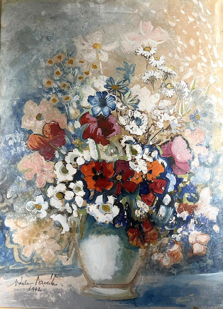 Zátiší s lučním kvítím od Václava Pavlíka, pro kterého je tento námět charakteristický. Umělec věnuje všechnu pozornost rozličným tvarům a barvám jednotlivých květů, které dohromady působí jako pestrobarevný výbuch. Vše doplňuje jemně modré pozadí a tečkovaná struktura v horní části obrazu. Kombinovaná technika na papíře, rámováno pod sklem, rozměry s rámem 88 x 68 cm, rozměry díla 60 x 44 cm. Signováno vlevo dole "Václav Pavlík 1942".