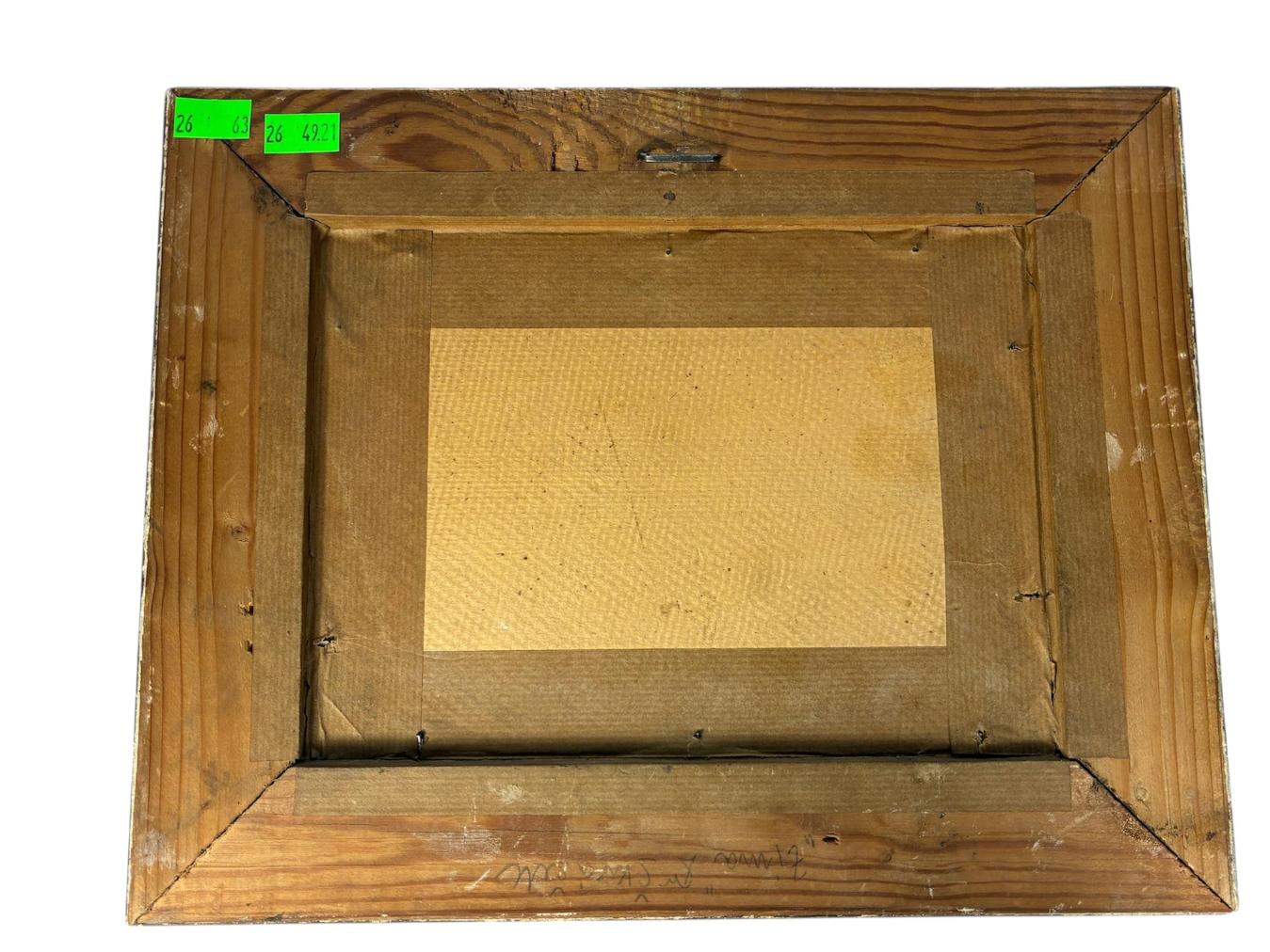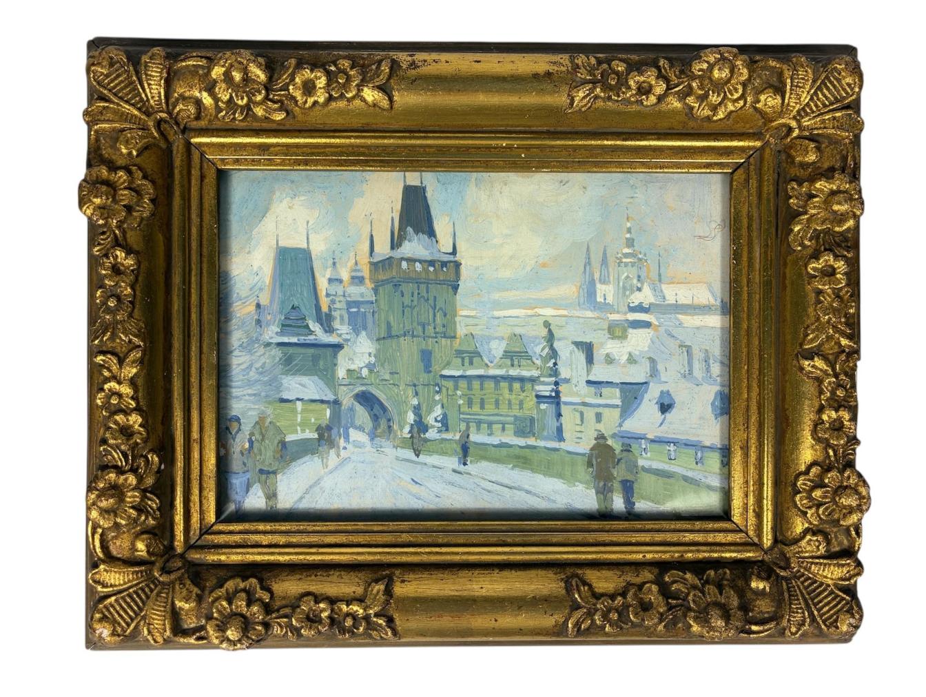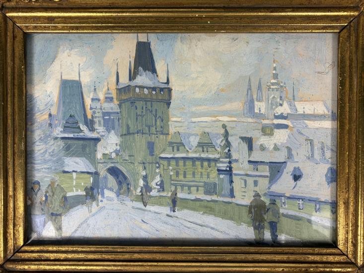 Zachycen Karlův most a Pražským hradem v zimním období v podání tempery na kartonu. Na malbě jsou použity studené barvy, aby vyvolaly pocit chladu a navodily co nejpřesnější atmosféru zimního světla. Rozměry se zlaceným rámem jsou 29 cm x 23 cm a bez rámu jsou 19 cm x 13 cm. Na zadní straně se nachází zatím nerozluštěná signatura.