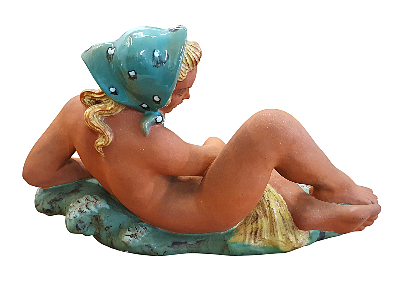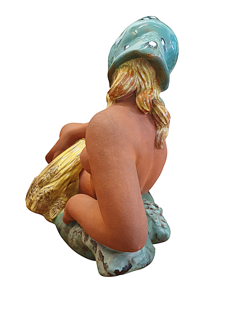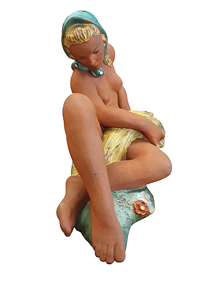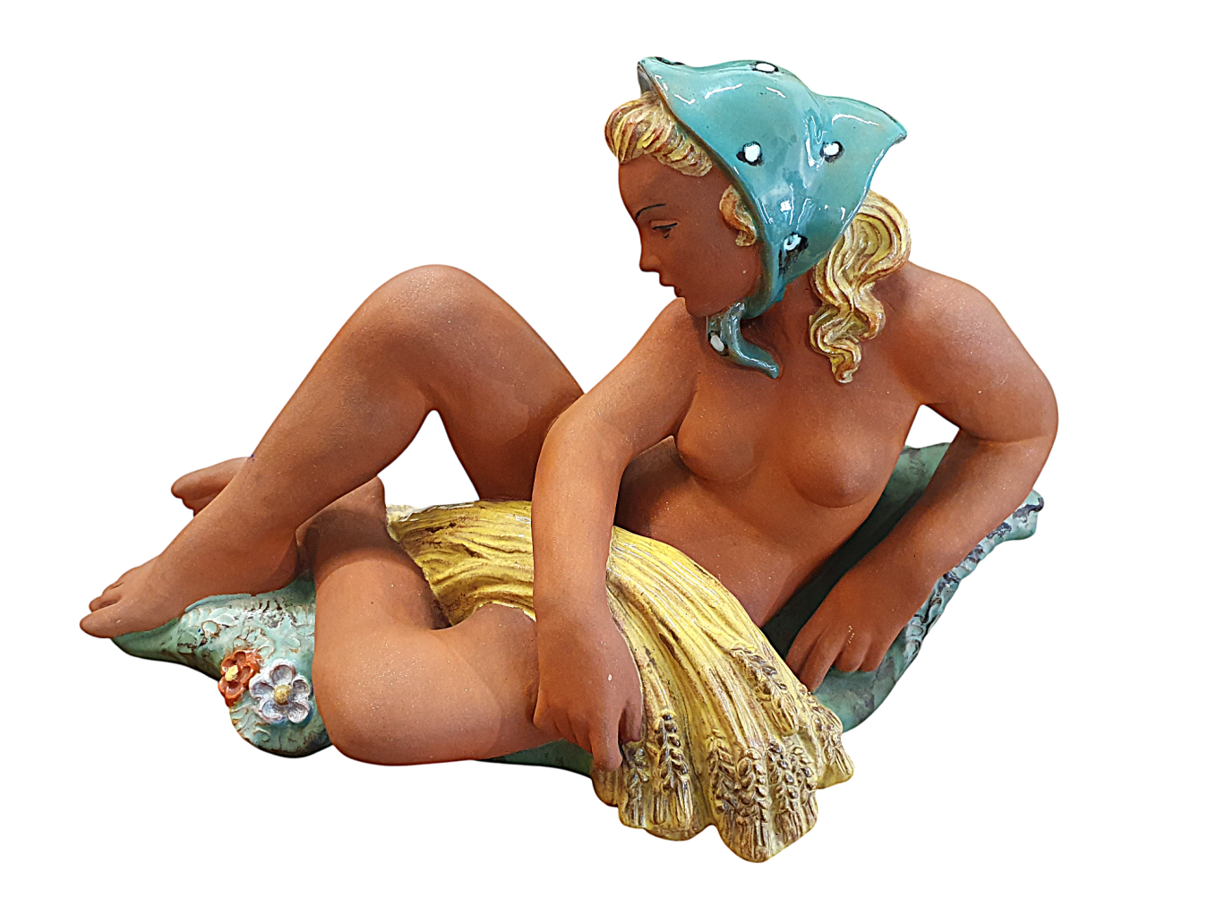 Prohlednout celou aukciTěžká keramická socha zachycující akt blonďaté dívky se zeleným šátkem a snůpkem žita. Dívka se ležérně opírá jednou rukou o zelenou trávu, na které můžeme zahlédnout plastické barevné květiny. Vyrobila společnost Keramia Znojmo. Socha je částečně glazovaná lesklou i matnou glazurou s biskvitovou plochou těla ženy, ručně dekorováno. Značeno ze spodní strany dole- Made in Czechoslovakia. Na výšku měří 27 cm, na délku 45 cm. Hloubka je v nejširším bodě 21 cm. V perfektním stavu bez poškození.