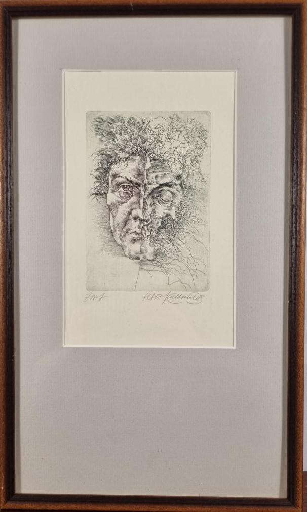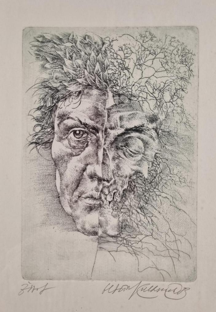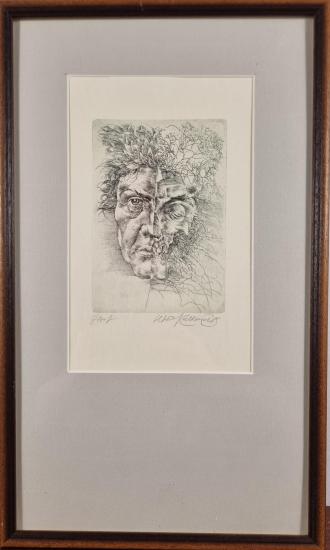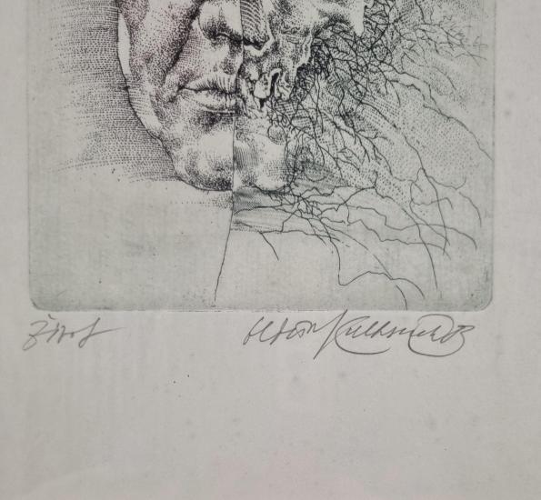 Prohlednout celou aukciGrafika s názvem Život od Oldřicha Kulhánka poeticky tématizuje smrt. Na jedné straně se díváme do tváře starci, který má na hlavě věnec a tvář plnou vrásek, na druhé straně se jeho tvář rozpadá, stává se lebkou a splývá s větvemi stromů. Grafika na papíře, rámováno pod sklem, rozměry s rámem 42 x 25 cm, rozměry díla 15 x 10 cm. Signováno dole vlevo "Oldřich Kulhánek 83".