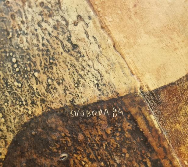 Prohlednout celou aukciMalba se sakrálním motivem od malíře Vladimíra Svobody. Autorův rukopis je velmi osobitý, vytváří místy reliéfní malbu, která má specifickou strukturu připomínající cákance barvy. Ježíšovo tělo působí jako vtlačené do formátu malby a obklopené drapérií. Autor sahá po symbolické červené barvě, kterou dotváří celý výjev, rudou barvu má i rám. Olej na sololitu, rámováno, rozměry s rámem 126 x 85 cm, rozměry díla 121 x 80 cm. Signováno v pravé části obrazu, viz foto.