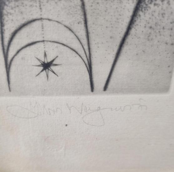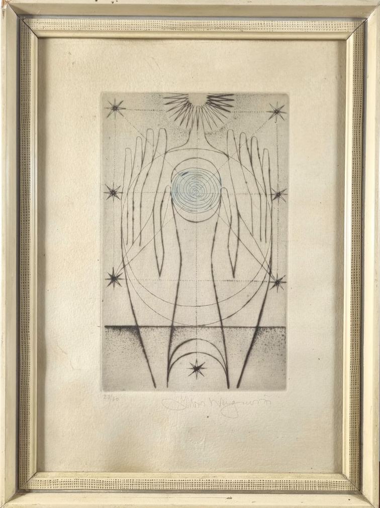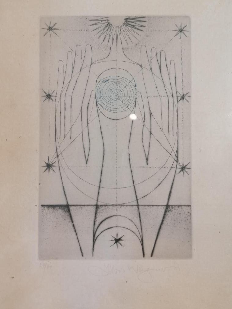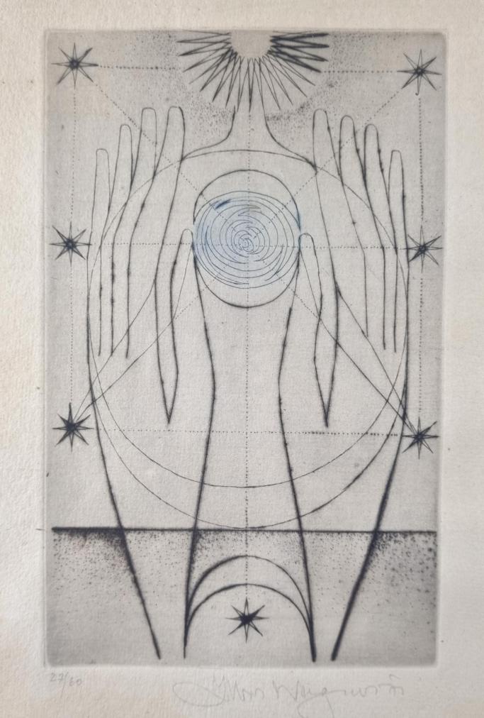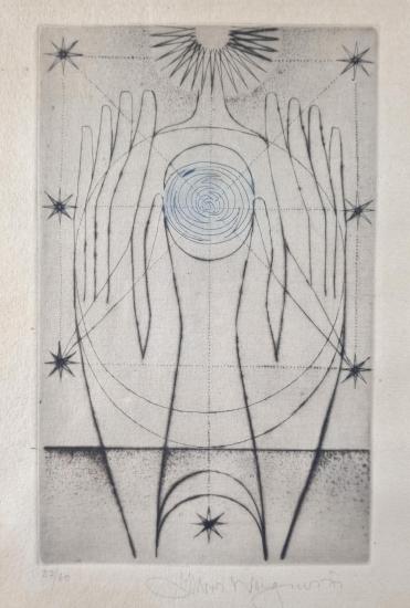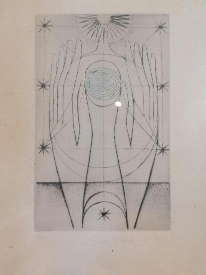 Prohlednout celou aukciSkvělá grafika od autora Libora Wágnera, představitele abstraktní a symbolické tvorby. V tomto díle vytváří symetrický námět, který rámují půvabné, podlouhlé ruce. Ty splývají s postavou v centru díla a námět působí silně alegoricky, jednotlivé motivy odkazují ke kosmické tématice. Technika suché jehly dovoluje umělci pracovat s nejjemnějšími linkami. Suchá jehla na papíře, rámováno pod sklem, rozměry s rámem 32 x 23,5 cm, rozměry díla 19 x 11,5 cm. Signováno dole uprostřed "výtisk 27/60 Libor Wágner".