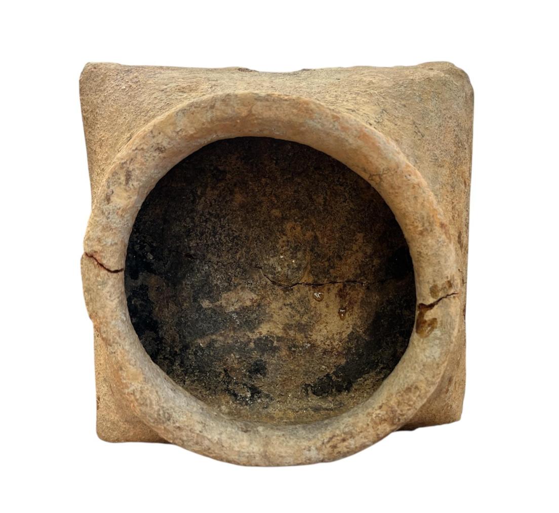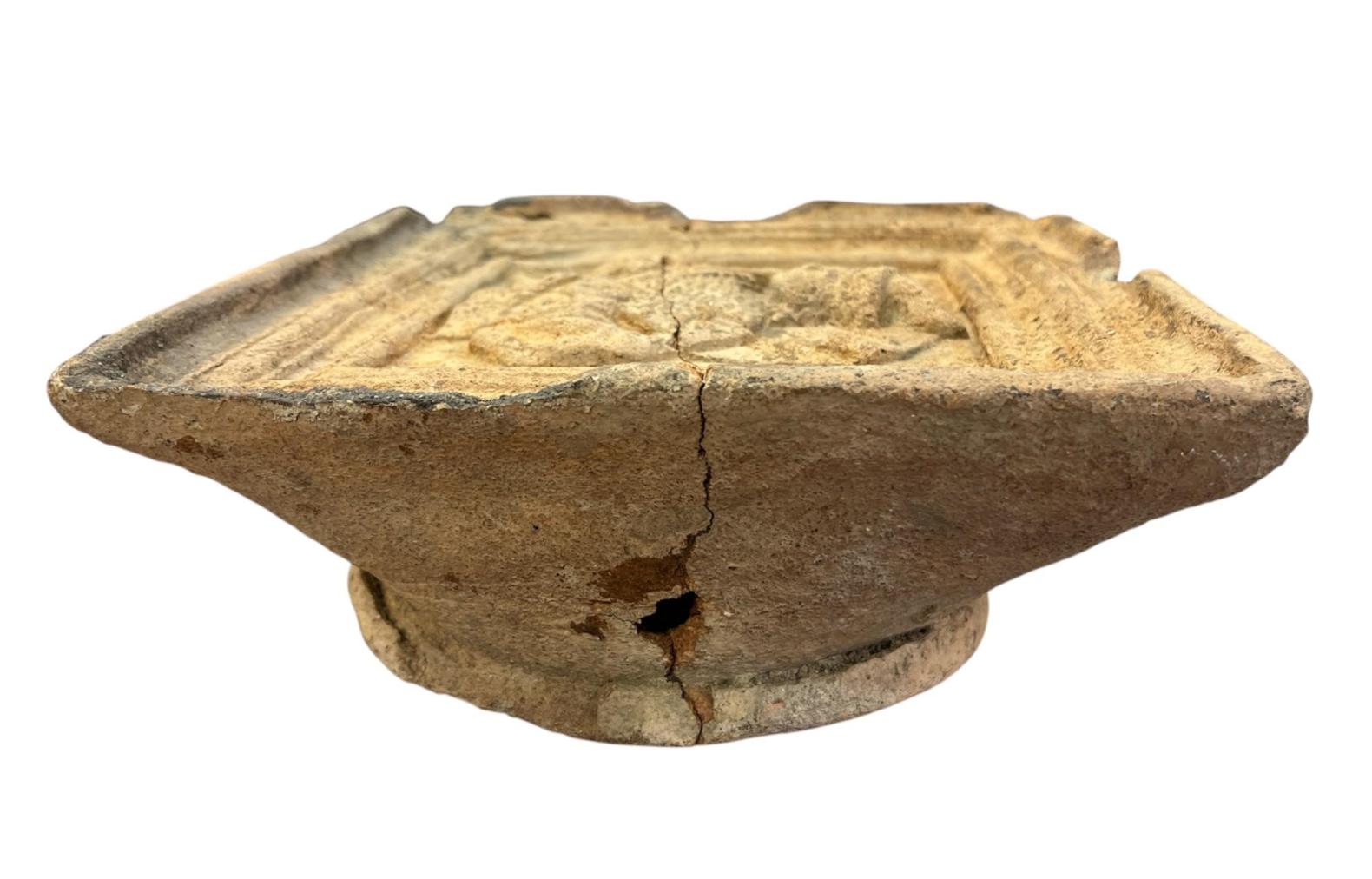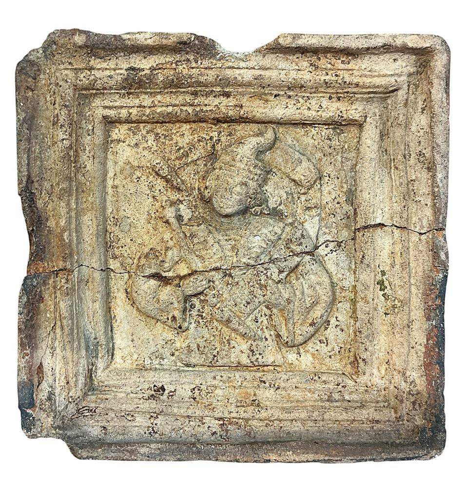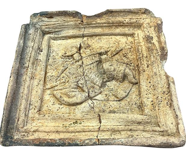 Keramická kachle s výjevem panovníka, v ruce drží žezlo a kolem něj se line stuha s nápisem, který není čitelný. Kachle byla lepena, uprostřed vede prasklina, viz foto. Keramika, hloubka 9 cm, rozměr 22 x 22 cm.