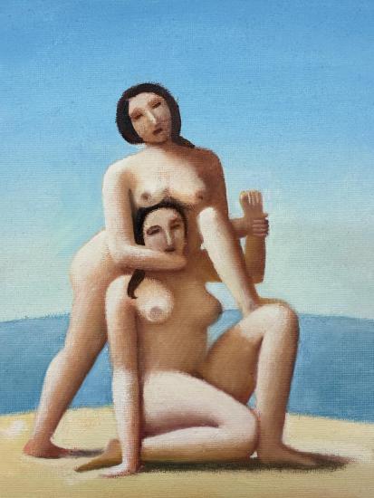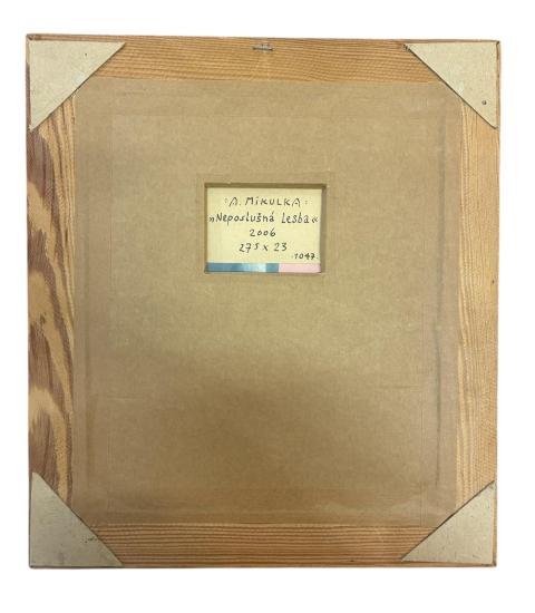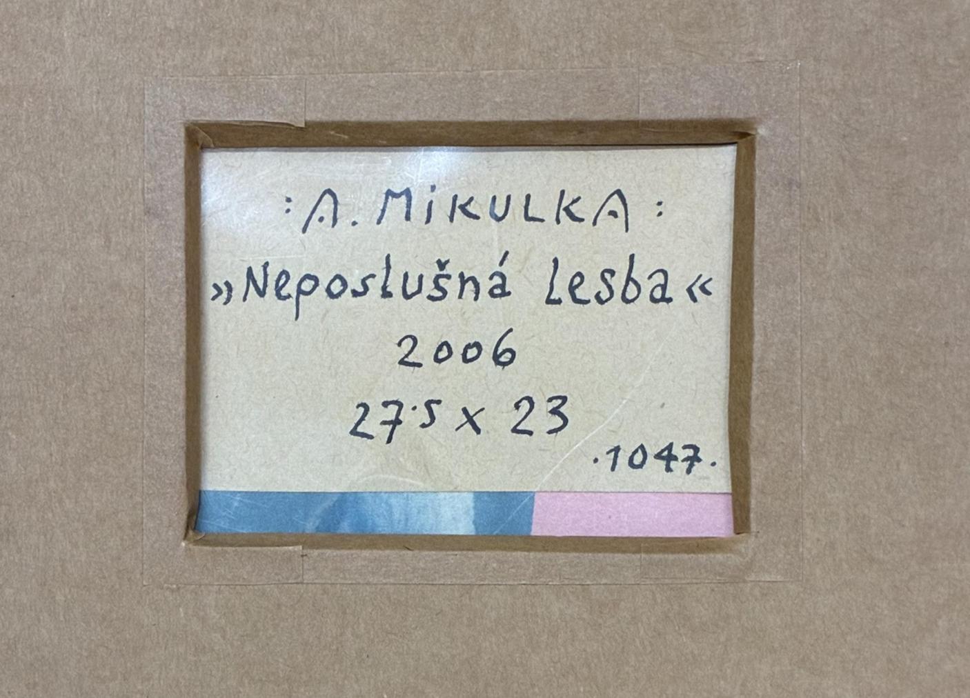 Malba temperou na plátně podlepené kartonem od brněnského umělce Aloise Mikulky. Scéna zobrazuje dvě nahé ženy nacházející se pravděpodobně na pláži. Jedna žena stojí a provokuje tu druhou sedící ženu. Malba má opět krásné tlumené pastelové barvy, takže působí klidným dojmem. Zezadu se nachází signatura A. Mikulka, název Neposlušná lesba, rok 2006 a rozměry bez rámu 27,5 cm x 23 cm. Rozměry s rámem jsou 32,5 cm x 36,5 cm. Rám je dřevěný a zboku působí dvojitým dojmem. Obraz bude součástí výstavy ,,Alois Mikulka - State Louis 1933,, která proběhne od 26.2.2026 v Graciano - atelier, Veselá 37, Brno. Podmínkou prodeje je, zapůjčení obrazu na celou dobu výstavy.
