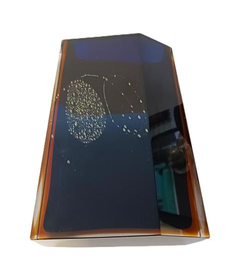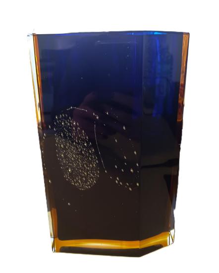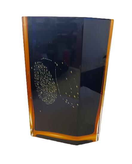 Krásná skleněná váza se zatavenou stříbrnou fólií podle návrhu Pavla Hlavy. Rozmery: 21,5 x 14 x 4,5 cm. Váza je ve skvělém stavu, nepoškozená.