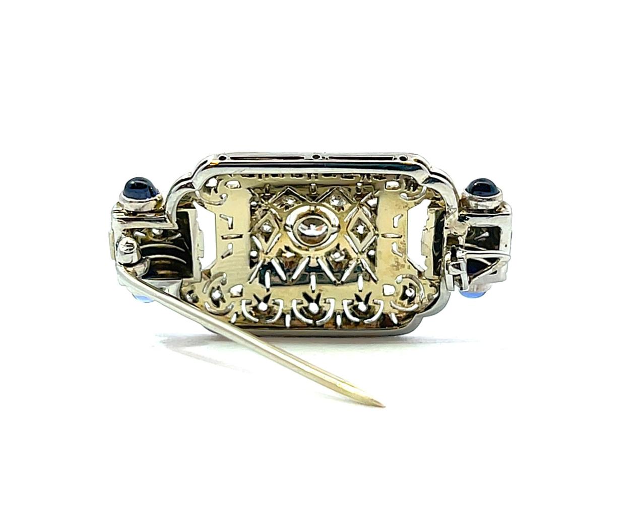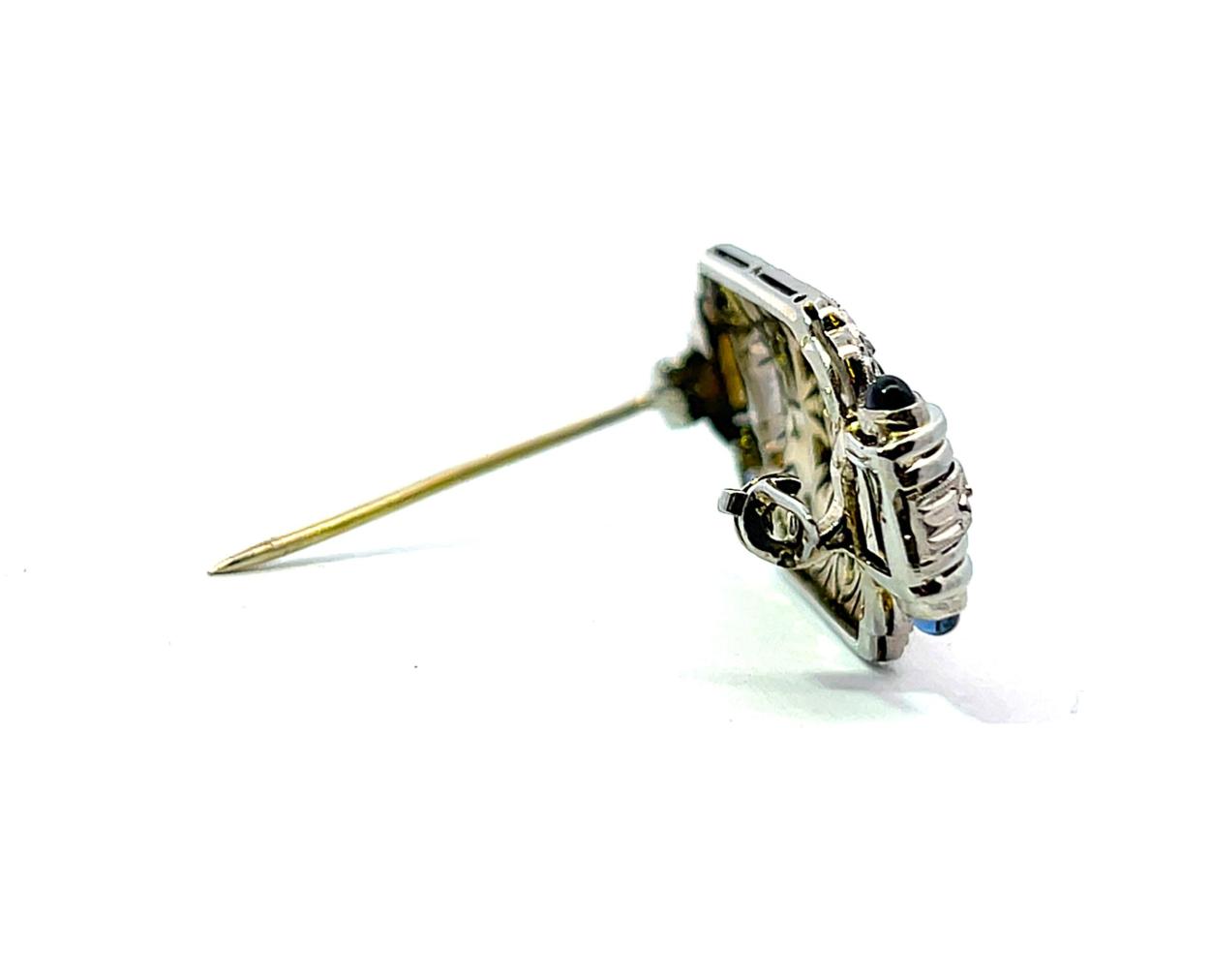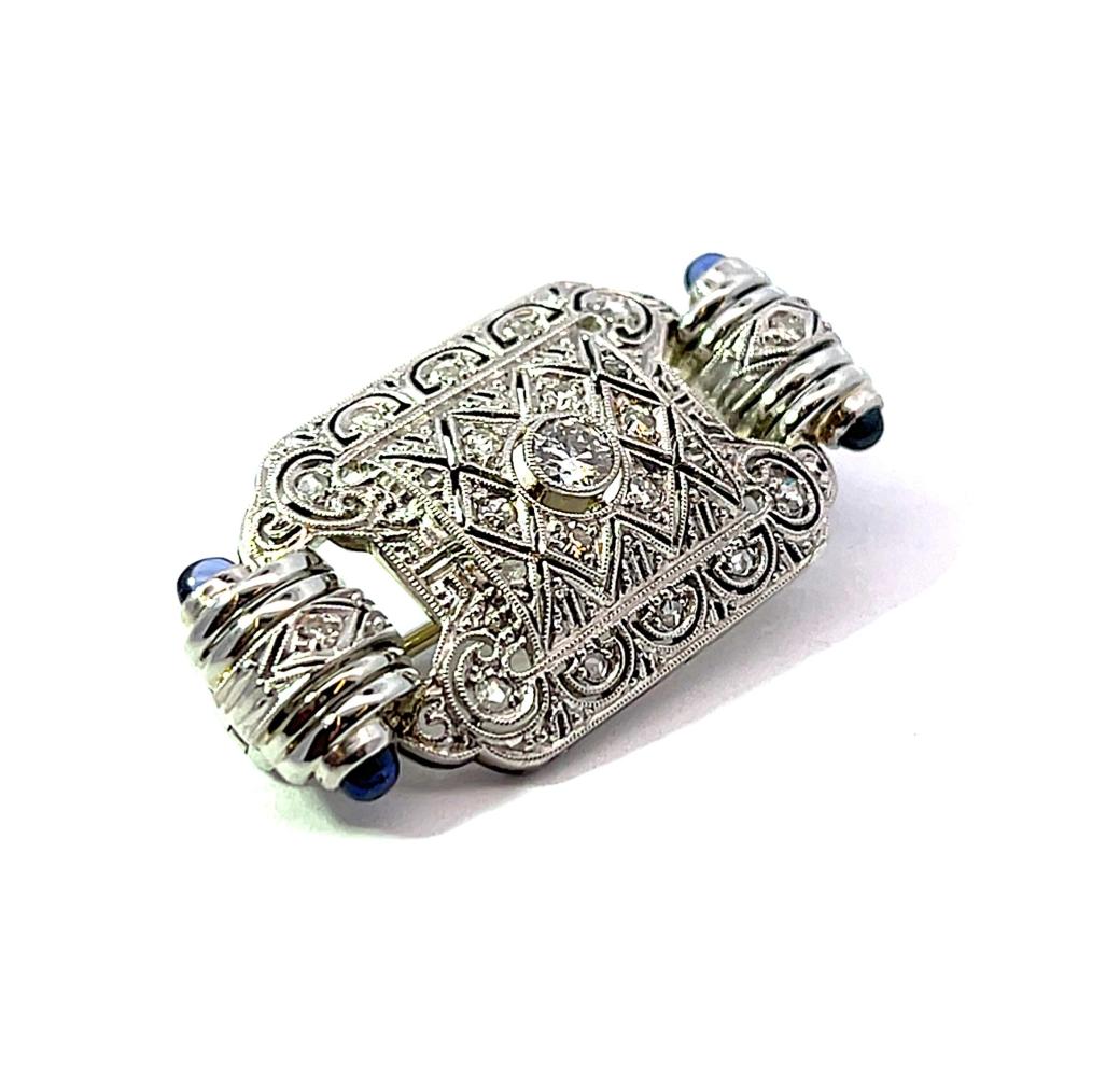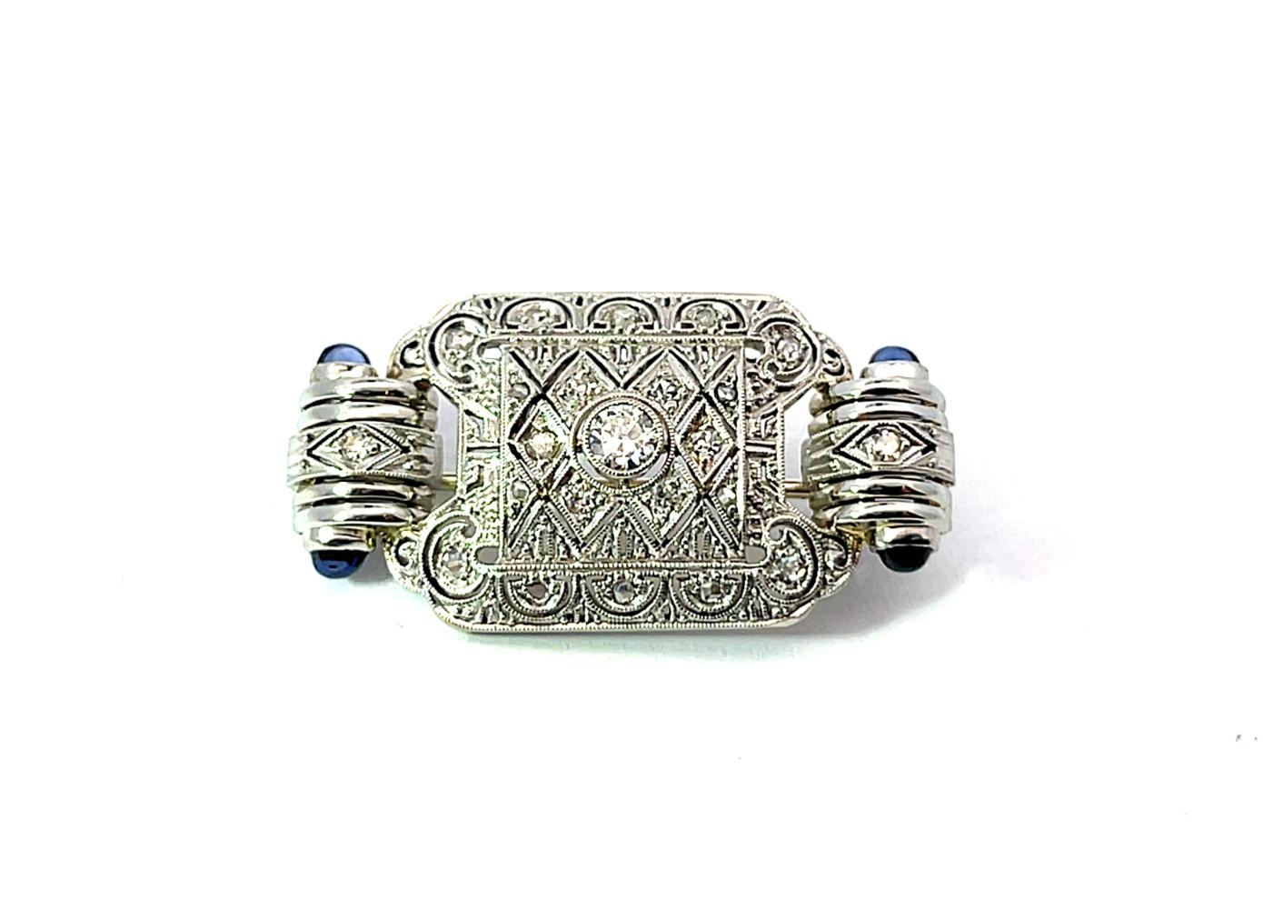 Brož z bílého zlata o ryzosti 585/1000, punc lyra. Váha 8,76 g, délka 34 mm, v nejširším bodě 18 mm. Kámen - přírodní diamant briliantového brusu - 9 ks, centrální kámen: 1 ks, cca 0,10 ct, okolní kameny: 8 ks, cca 0,02 ct každý - dohromady cca 0,26 ct. Kámen - přírodní diamant routa - 14 ks. Kámen - syntetický safír - 4 ks.