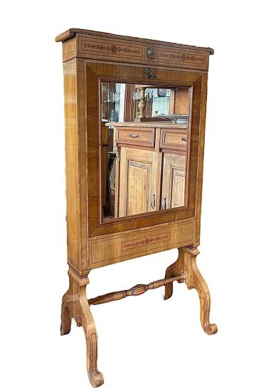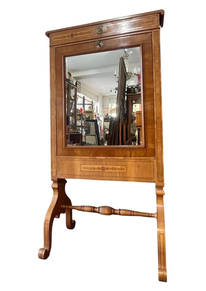 Krásný starožitný kus nábytku, sloužící jako dámský psací stolík s vyklápěcí deskou, zrcadlem a tajnou zásuvkou. Otevírání je na klíč, uvnitř se nachází pořadače na dokumenty a dva výsuvné šuplíky. Třešňové dřevo, styl Biedermeier. Na výšku měří 128 cm, na šířku 68 cm. Hloubka je 13 cm, rozpětí nožek je 41 cm. Psací deska má při vyklopení hloubku 46 cm a šířku 54 cm. Stolík je v dobrém stavu, ale nese lehké známky opotřebení a stáří. Neznačeno.
