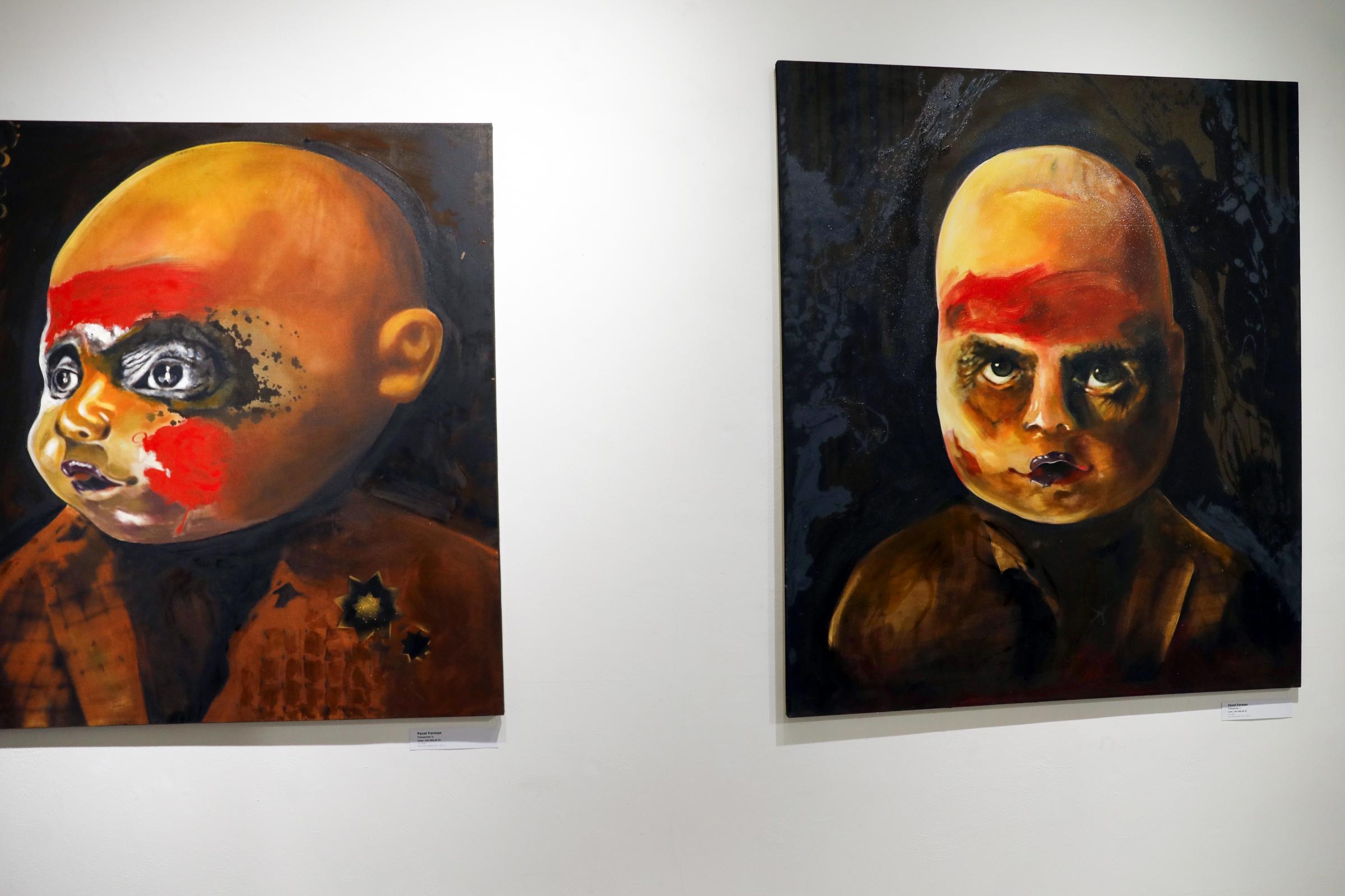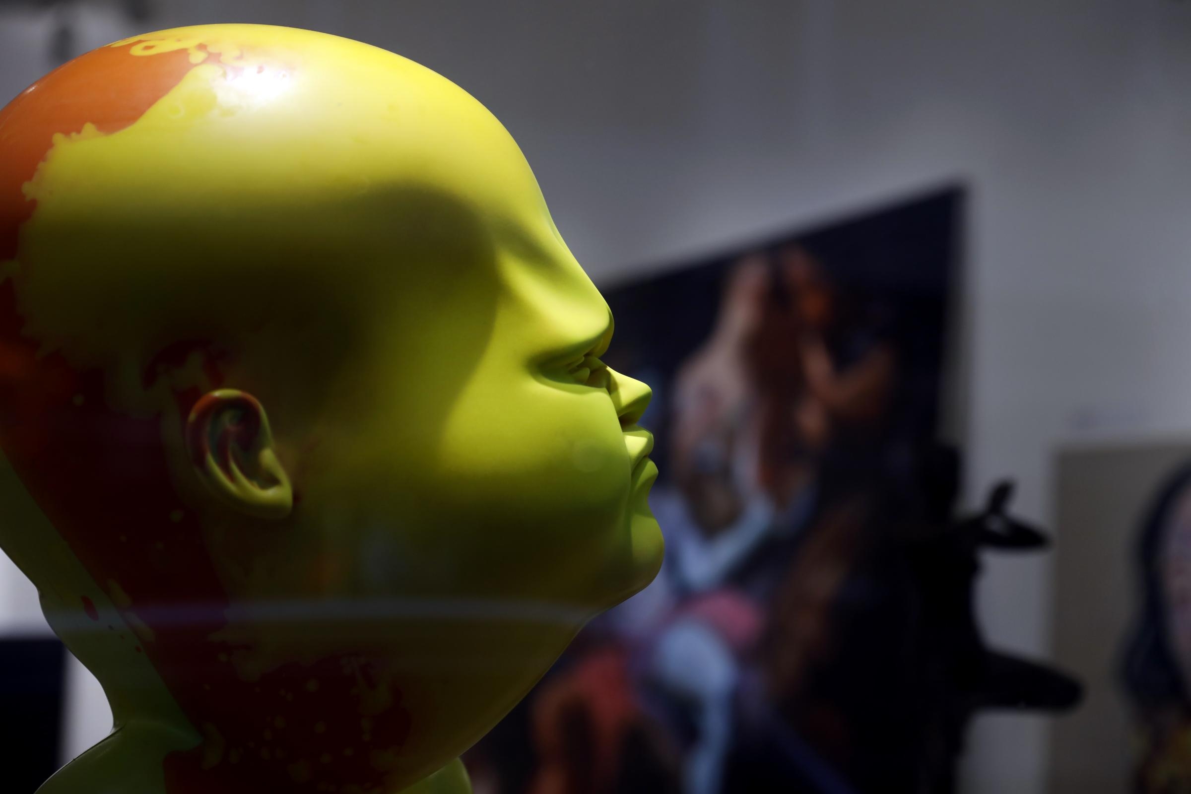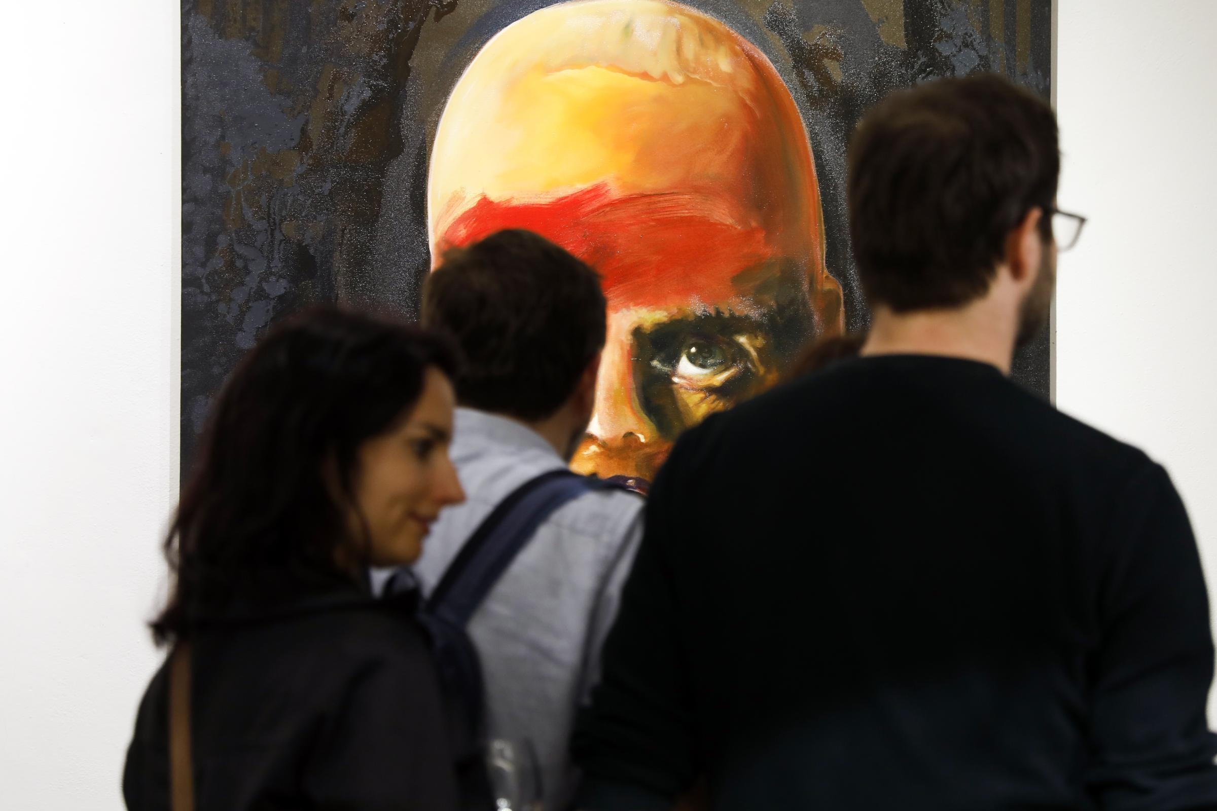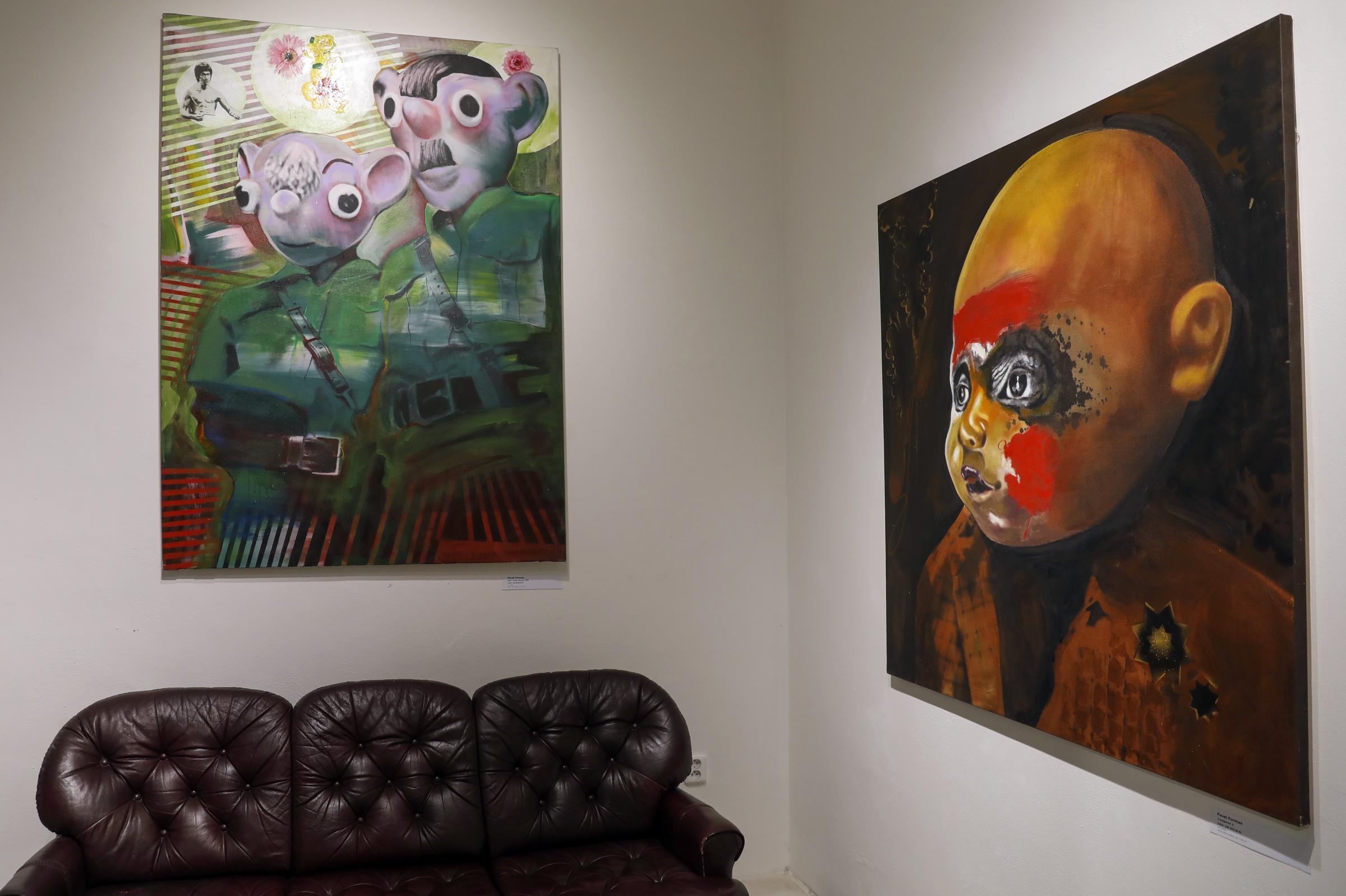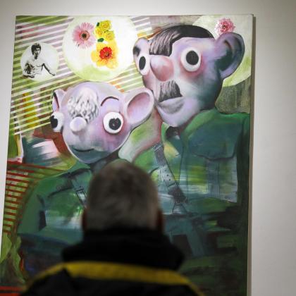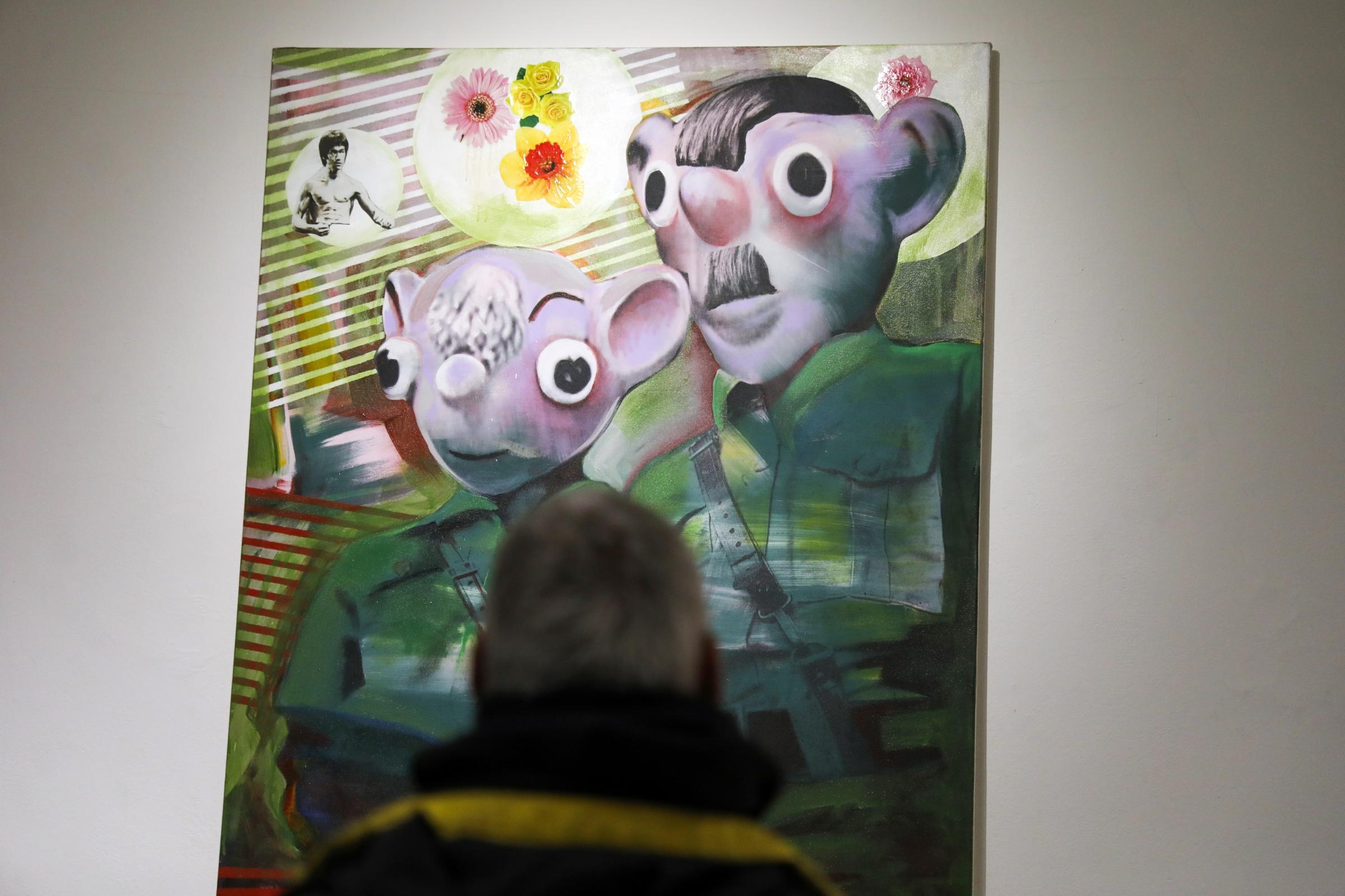 Vizuální koláž: Na plátnech se často setkávají postavy z historie, komiksů nebo mytologie v nečekaných a zneklidňujících kontextech.